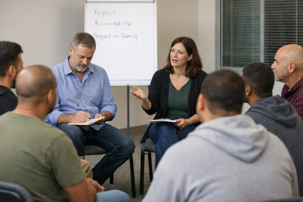 A Men’s Behaviour Change Program (MBCP) is a structured, group-based program designed for men who have used violence, coercive control, or abusive behaviour in relationships.